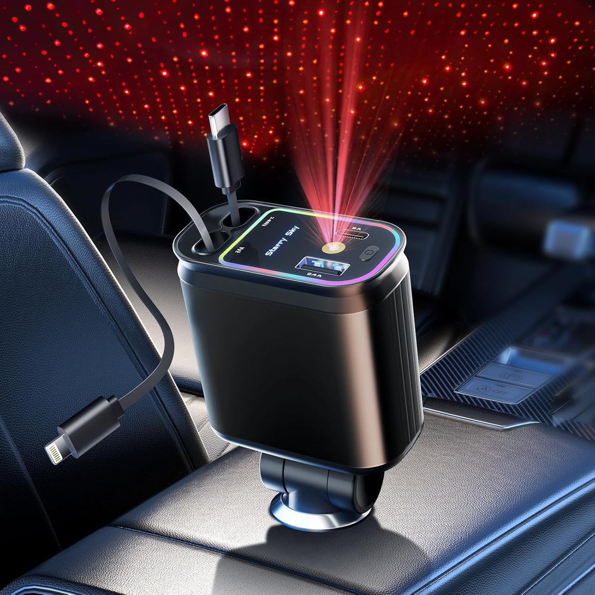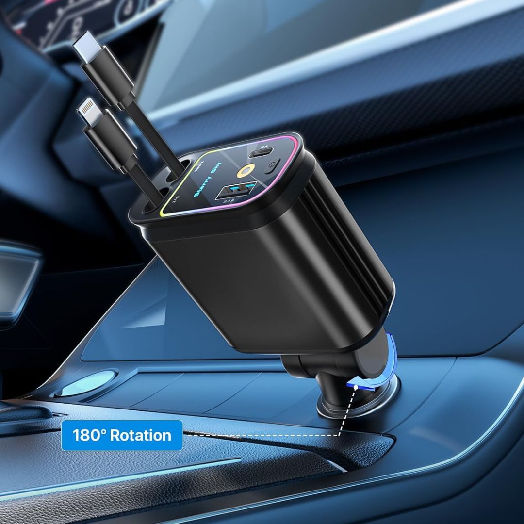 - el cargador de coche rápido 4 en 1 con dos cables retráctiles (tipo C e IOS) y dos puertos adicionales (USB-C y USB-A), eliminando la molestia de llevar múltiples cables y cargadores. Este adaptador de cargador de coche permite una carga rápida de hasta cuatro dispositivos simultáneamente, eliminando la necesidad de múltiples cargadores y manteniendo tu automóvil libre de desorden.